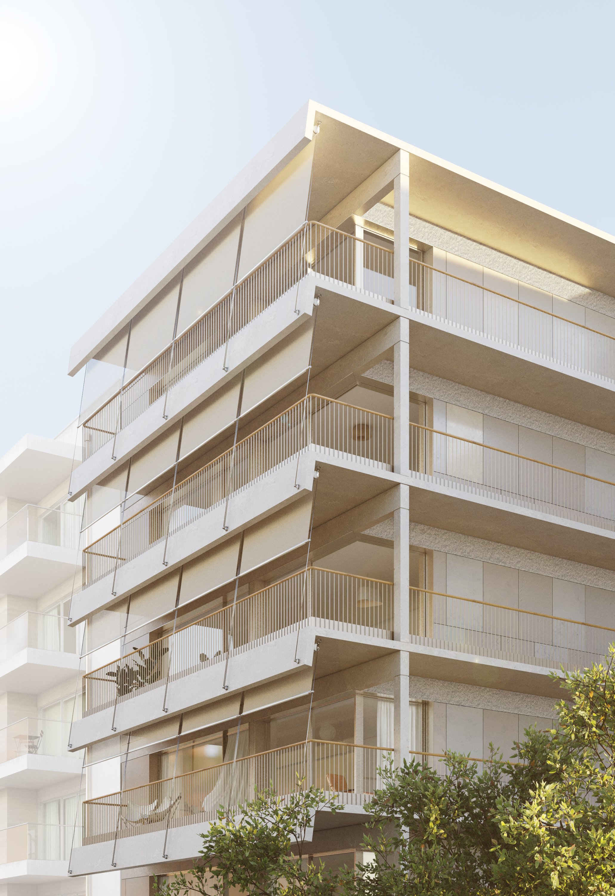 This duality is expressed in the façades. On the east, concrete slabs bend upward to provide privacy and protect the interiors. On the west, the slabs tilt downward, shading the lower floors and forming large terraces that extend the living areas. Fabric sunshades, aligned with the concrete geometry, filter the summer light and dialogue with the sails on the horizon.