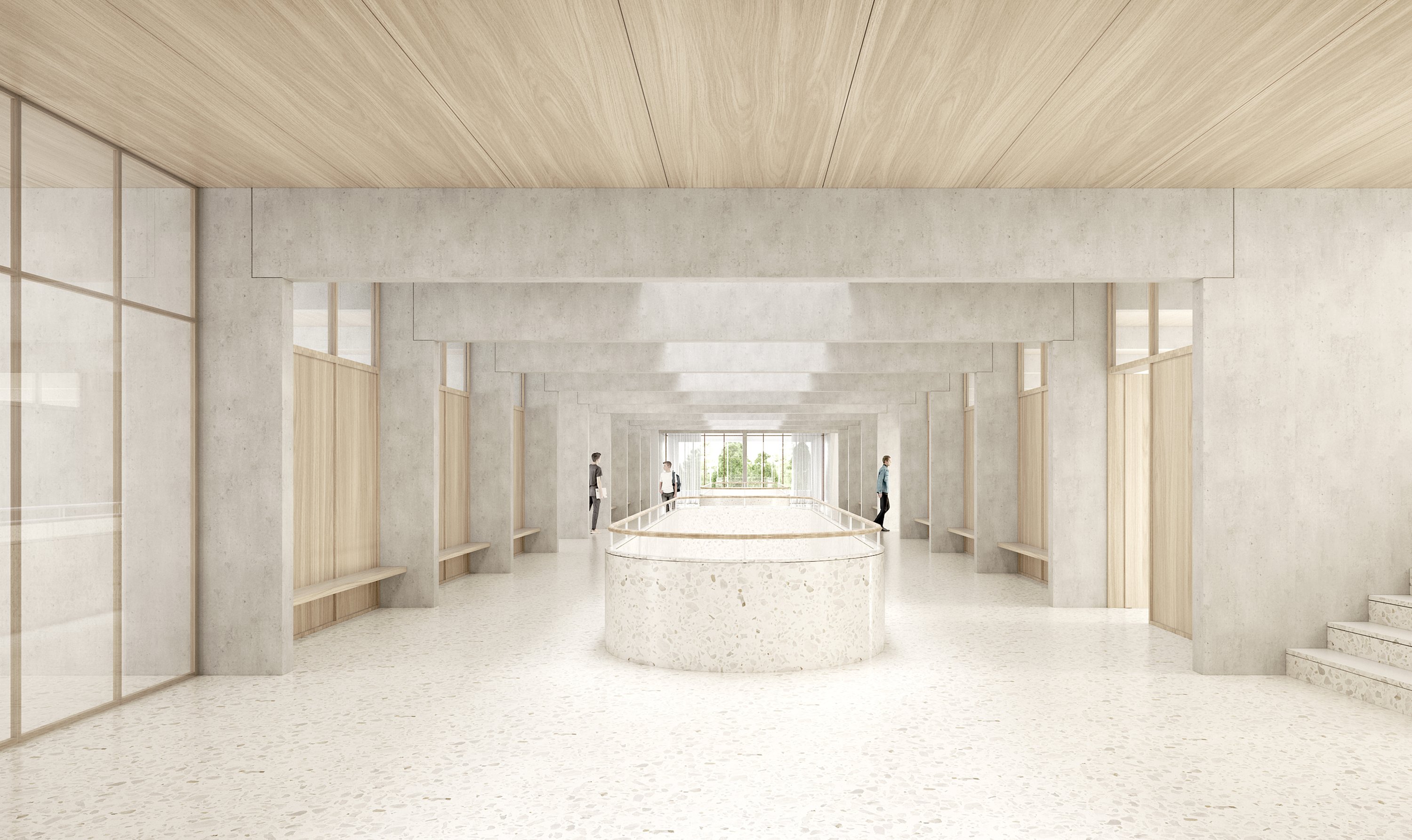 The building’s supporting structure is conceived as a wood–concrete hybrid. A regular concrete skeleton, designed with slim, repeatable frames, forms the basis. Prefabricated semi-finished elements can be produced off-site and assembled efficiently, shortening construction time and optimizing the building process.