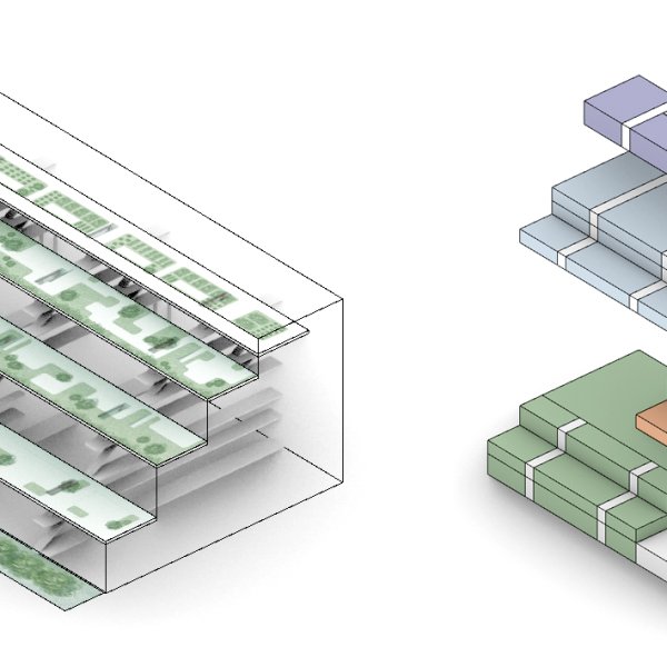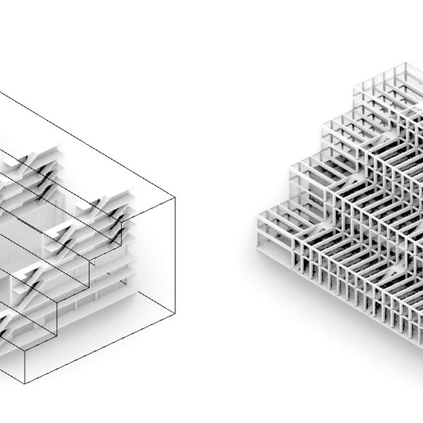 Three vertical cuts organize the volume and form the circulation system. Open, single-flight staircases follow the terraces, allowing students to reach their classrooms directly and intuitively. An internal southern stairwell complements them, ensuring clear and efficient connections between all floors. These three caesuras give structure, orientation, and safe escape routes.