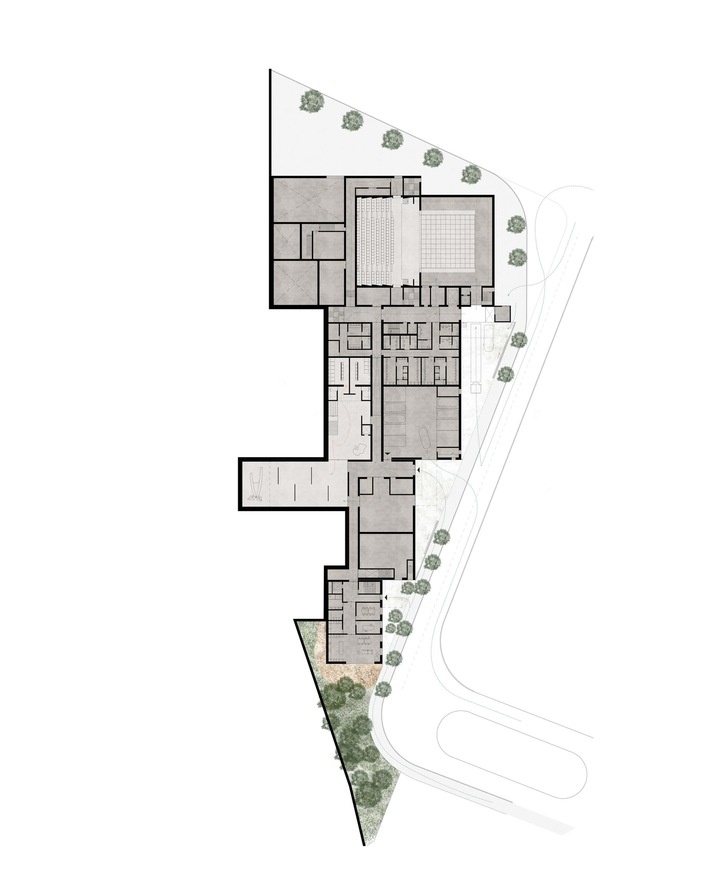 At its core lies the Square of Culture, a civic void designed to act as a point of convergence, capable of adapting to everyday use, cultural programming, and large-scale municipal events. Defined by permeable paving, shaded seating, a performance platform, and a naturalistic garden, the square is enclosed scenographically by the volumes of the building. The continuity of the atrium with the square blurs interior and exterior space, reinforcing the idea of public openness. Sustainability informs the design through permeable surfaces, low-maintenance native vegetation, and a green roof that improves climate comfort and enhances the building’s urban image.