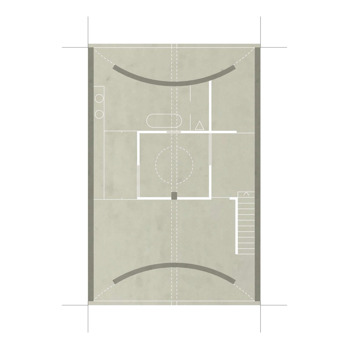 Strong walls, independent columns, and a curved concrete roof create large open spaces, support the pool, and bring light into the building.