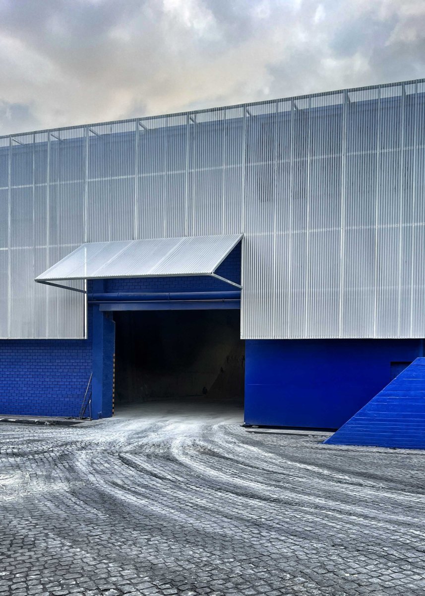 The façade of this sugar refinery is articulated as a continuous layer of white perforated metal panels, arranged with disciplined, almost textile-like regularity.