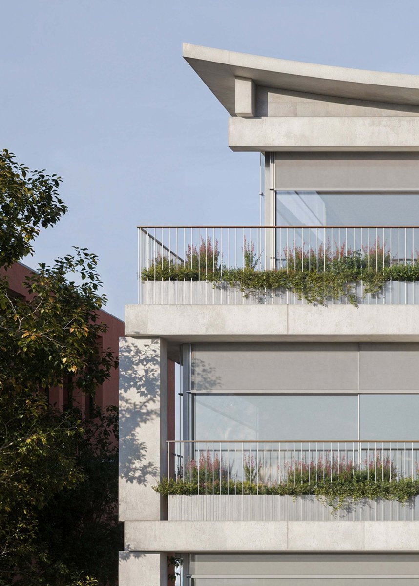 A balanced façade, where heritage and contemporary architecture coexist in a single urban gesture.
