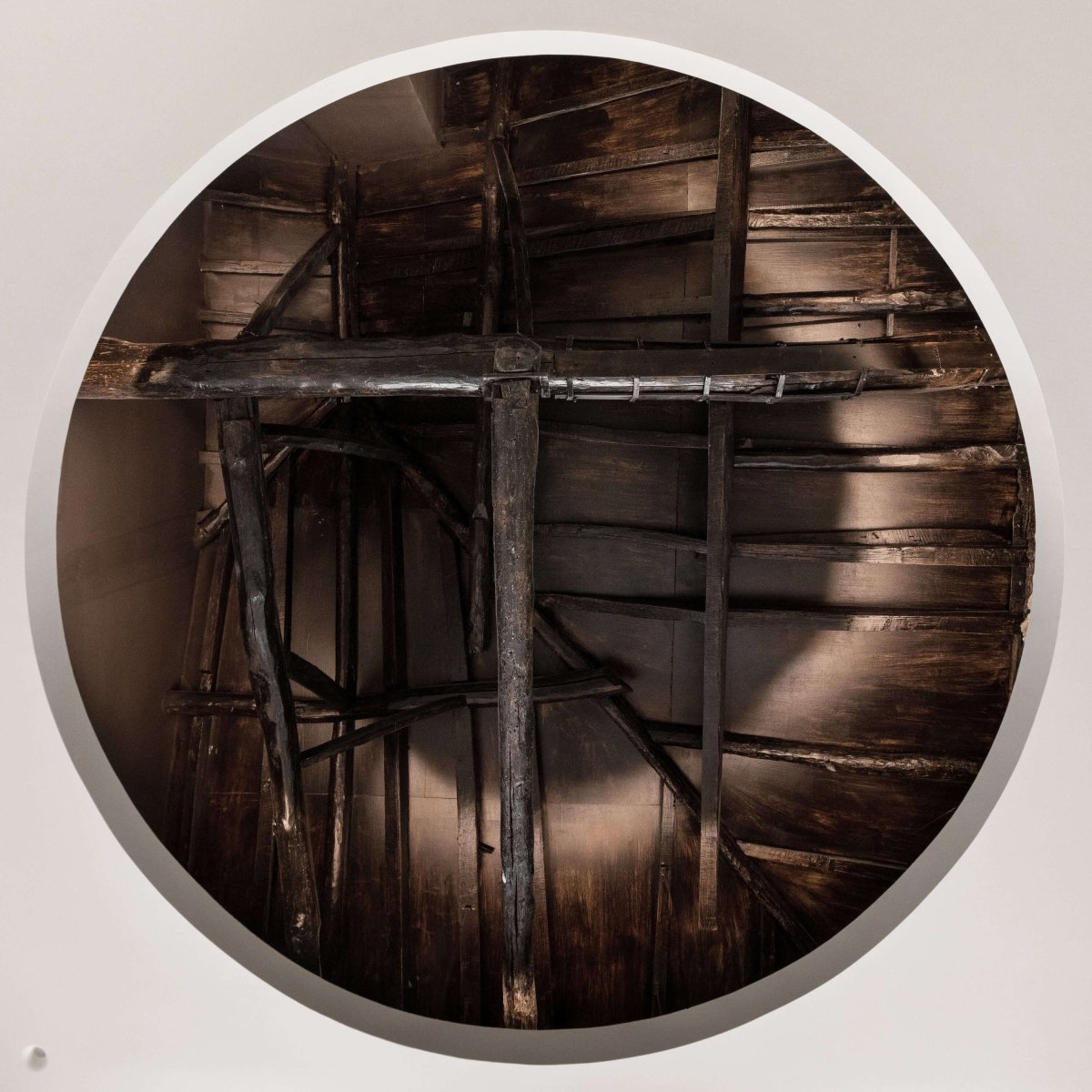 Reconstructing the ruin: timber frames emerge from the ancient stone volumes.